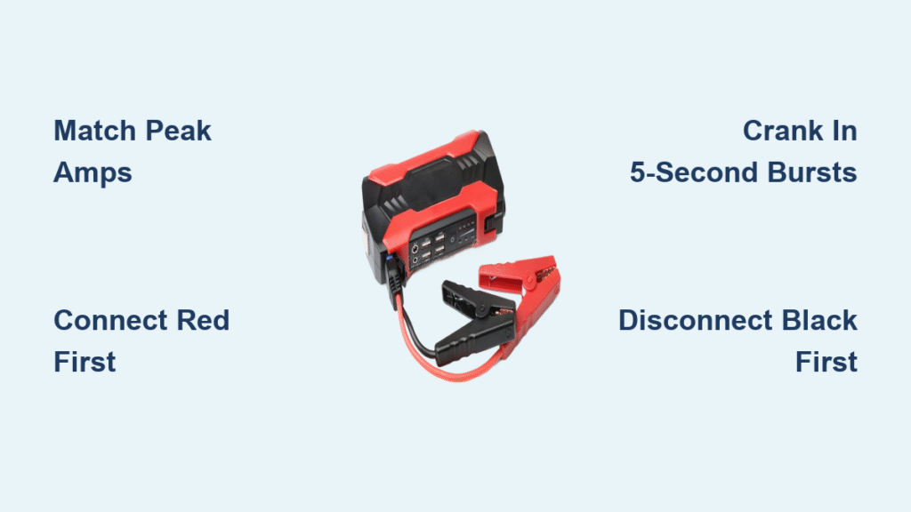 2. Match jump starter to engine size (400-600A for 4-cyl, 1000A+ for V8)