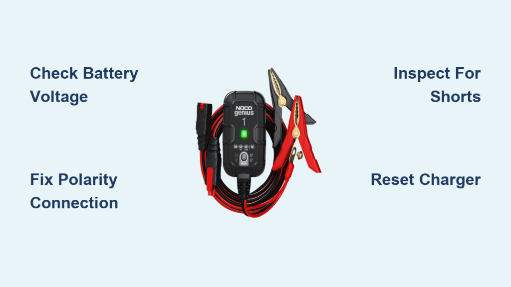 Your NOCO battery charger suddenly starts blinking red instead of charging your car, boat, or RV battery. That steady 1-second