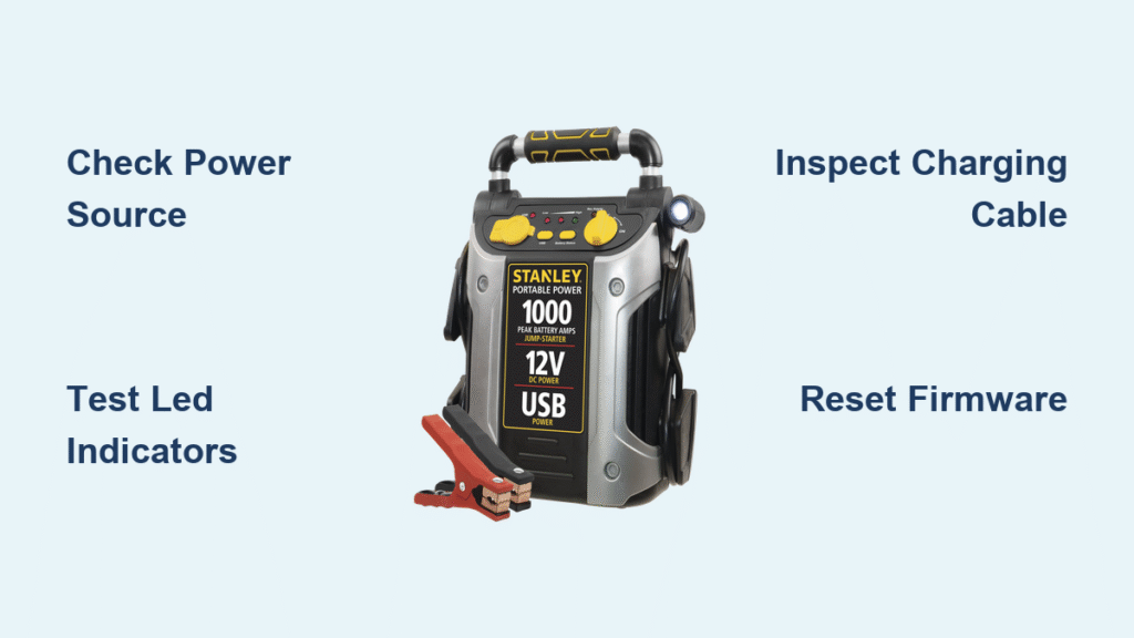 Most charging failures stem from simple issues like power source problems or connection corrosion rather than catastrophic internal damage. The key is systematic testing—starting with the easiest fixes before moving to complex repairs. This guide walks you through proven diagnostic procedures that Stanley technicians use, saving you time, money, and the frustration of being stranded with a useless jump starter when you need it most.